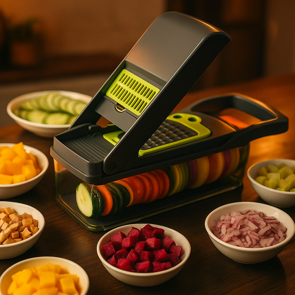 Simplifiez la cuisine avec ce coupe-légumes moderne à pression. En un seul geste, découpez vos légumes en dés, lamelles ou julienne comme un pro !